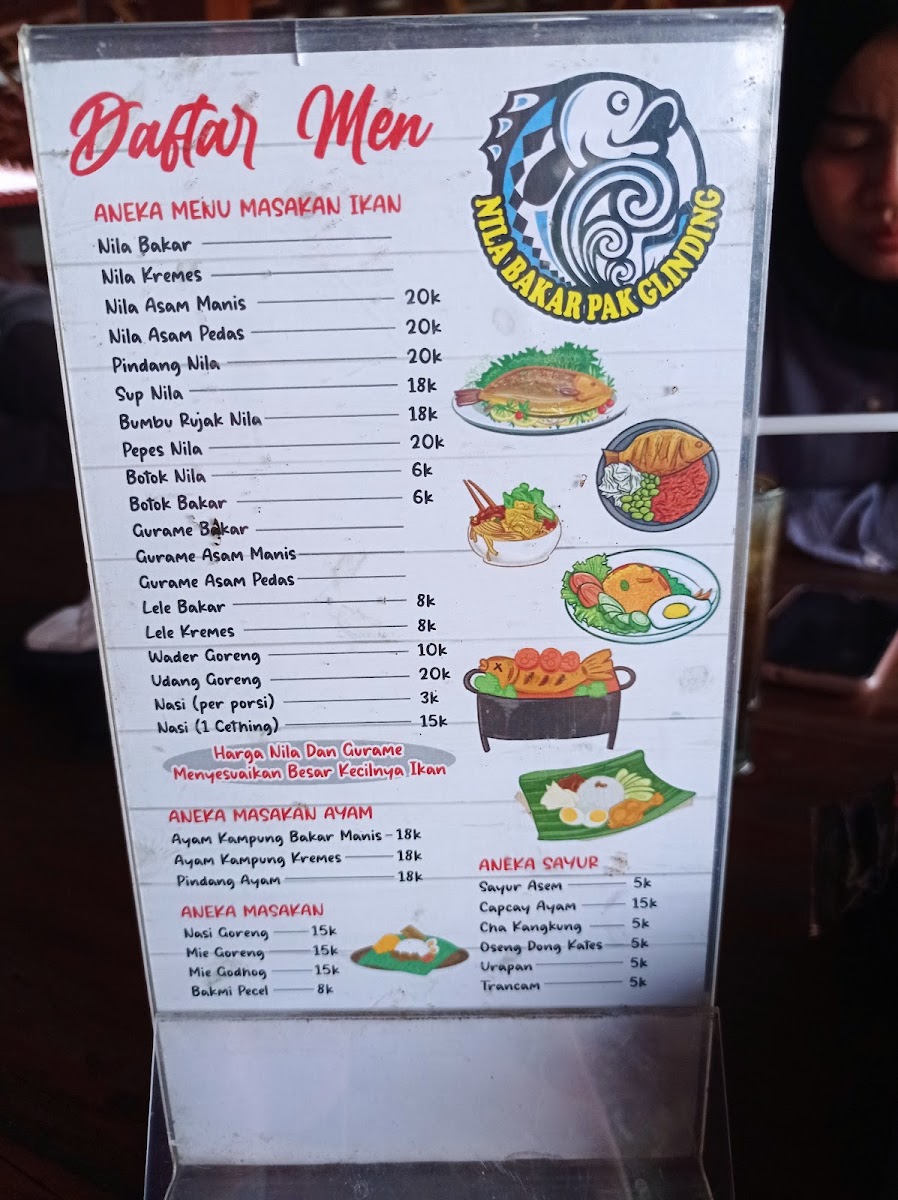 As you enter, you'll be greeted by a friendly staff and an inviting setting, featuring both traditional seating and comfortable tables. The menu proudly showcases a variety of fresh water fish dishes, with the star attraction being the savory Bumbu Rujak Nila. Other offerings include succulent chicken, vibrant vegetable salads, and delicious sweet fried bananas.
